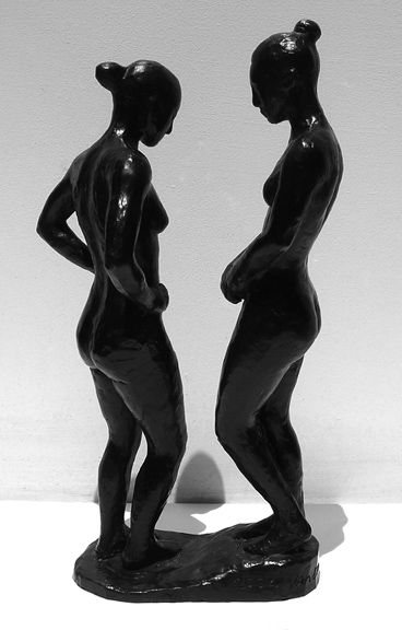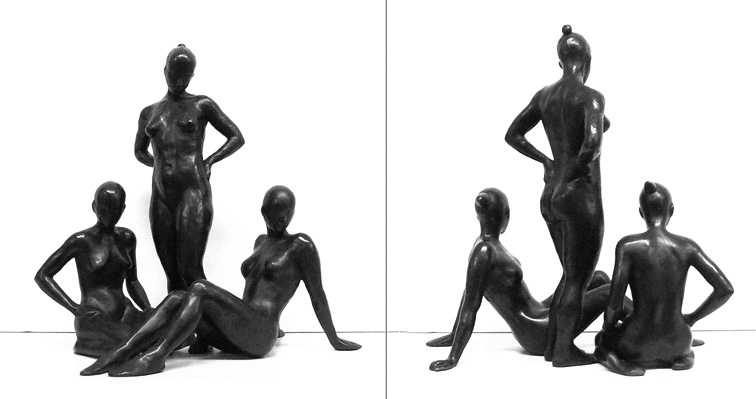 These original sculptures are first modeled in wax with an internal steel armature. They are then cast in silicon bronze with a black patina and black granite base.