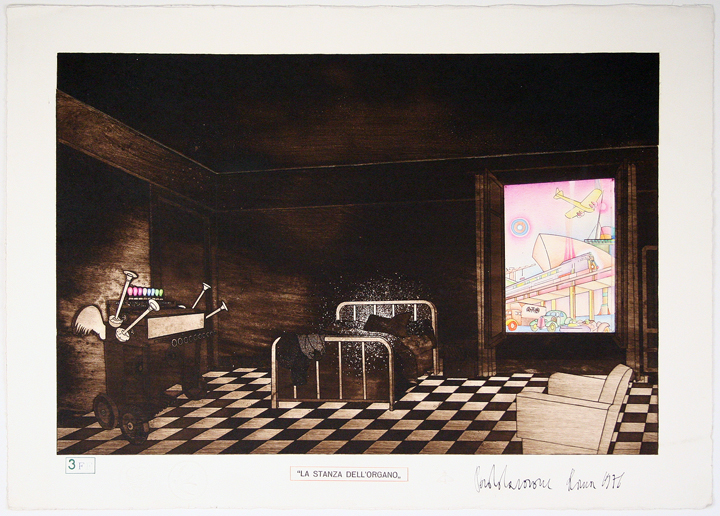 Original etching and aquatint with hand coloring on Fabriano wove paper, with three of the artist’s blindstamps in the lower margin: “Paolo Carosone, Roma, 1976”. A unique impression from a varied edition. In very good condition, unframed. Platemark: 15 7/8” x 23 3/4”; Sheet size: 19 7/8” x 27 7/8” |