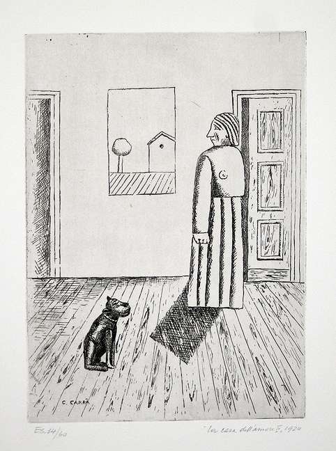 Original etching and drypoint on copperplate paper. Signed in the plate "C. Carrà," lower left. Inscribed in pencil "ES. 34/60, La Casa dell' Amore II 1924" in the lower margins. An impression from the edition of 60 for the portfolio "Opera grafica di Carrà," aside from an edition of 25 printed in 1924, and an edition of 10 printed in 1951. Published by De Tullio di Milano, 1971. In excellent condition, framed with conservation materials.