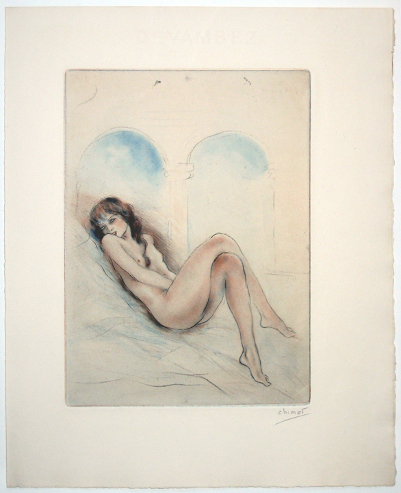 | Original etching and aquatint printed on cream wove paper with full margins and deckled edges. Hand signed by the artist in pencil, lower left "Chimot" and also in the plate "Chimot" in lower right. In excellent condition, unframed. Platemark: 7"x 5 1/2"; Sheet size: 13" x 10" |