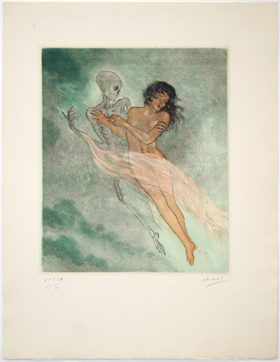 | Original etching with aquatint printed in colors on cream wove paper with full margins and deckled edges, bearing a ram's head watermark. Hand signed by the artist "Chimot" in pencil, lower right. A fine impression from an edition of 50, numbered "XXXVI/L" in pencil, lower left. In excellent condition, unframed. Platemark: 8 1/4" x 6 3/4"; Sheet size: 13 1/8" x 9 7/8" |